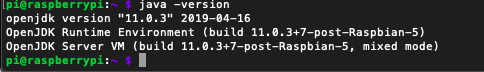 When the Raspberry Pi has installed the Java 11 packages you should be able to run ”java -version” and have the following output: